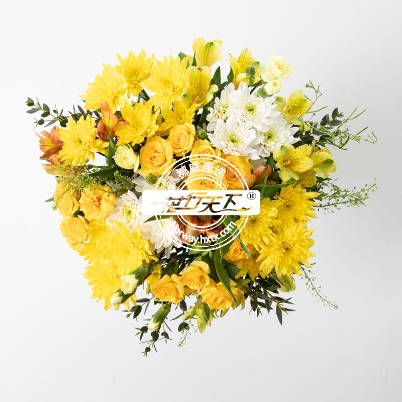 玫瑰、非洲菊、菊花、时令鲜花和绿叶组成、样式如图.